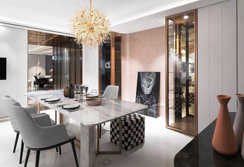 ◆餐厅的走廊设计师用古铜钛金材料做成了金属质感的栅栏隔断。用餐区域以浅色玫瑰色衬托出玻璃展示柜的高雅。