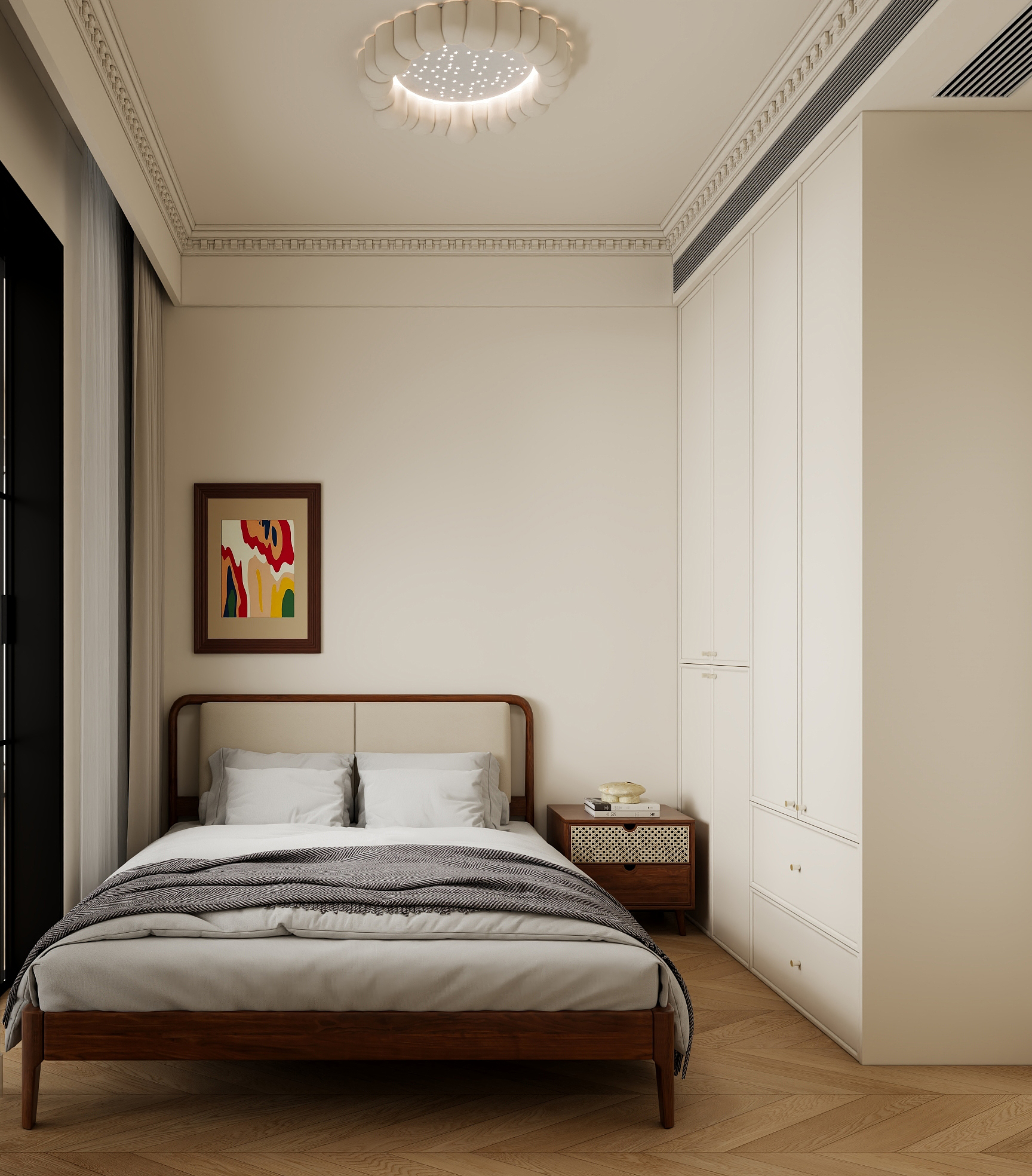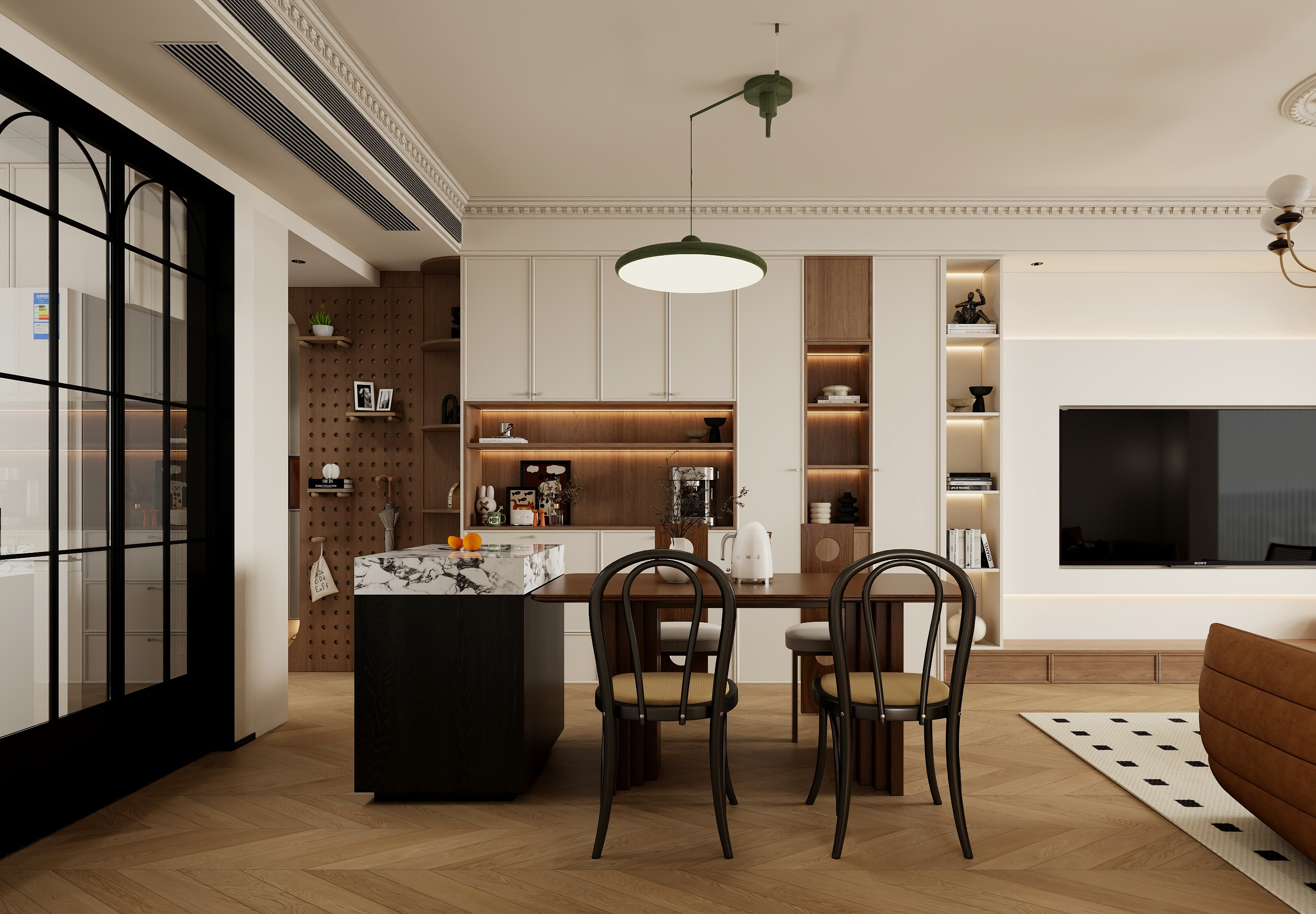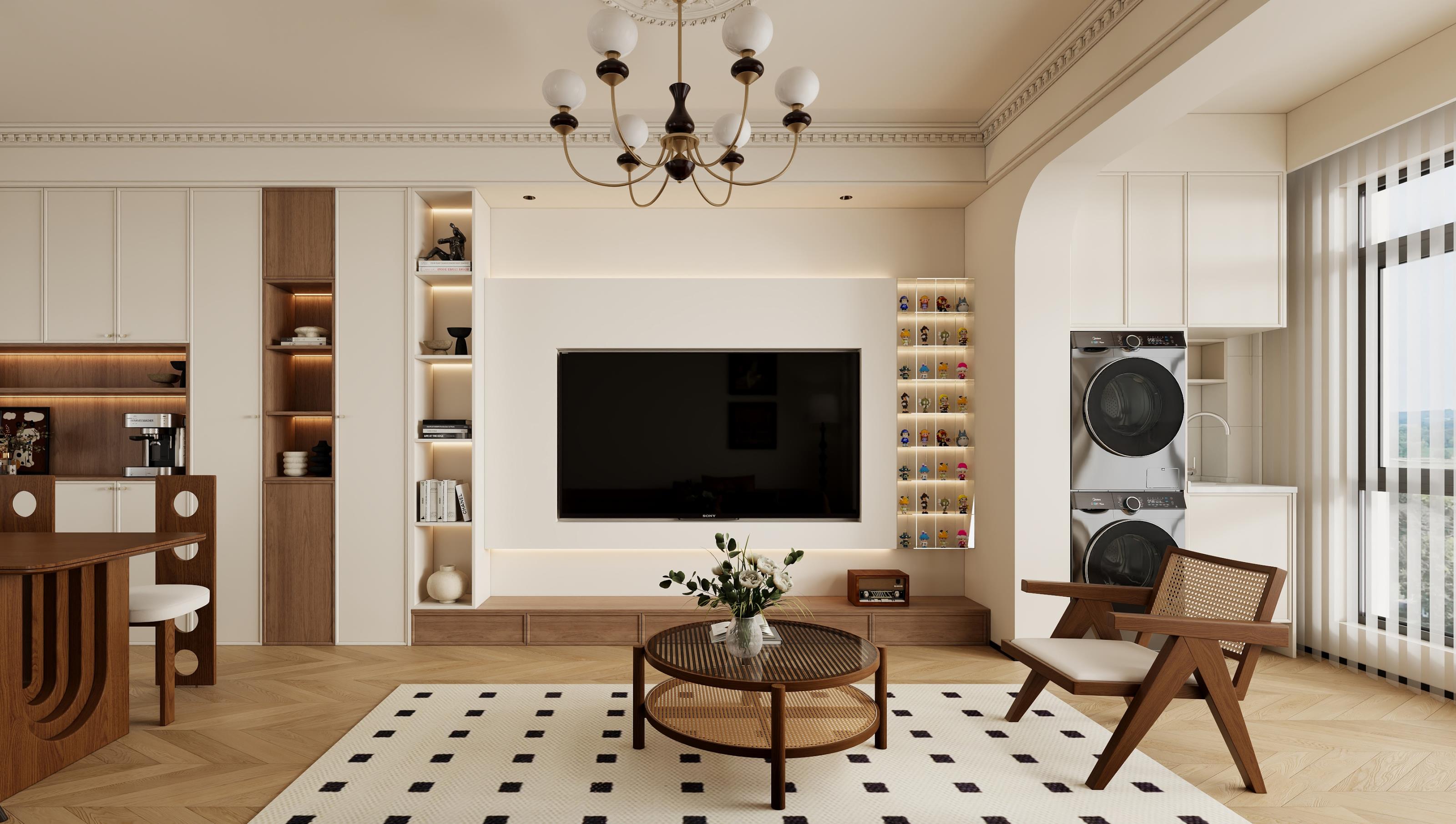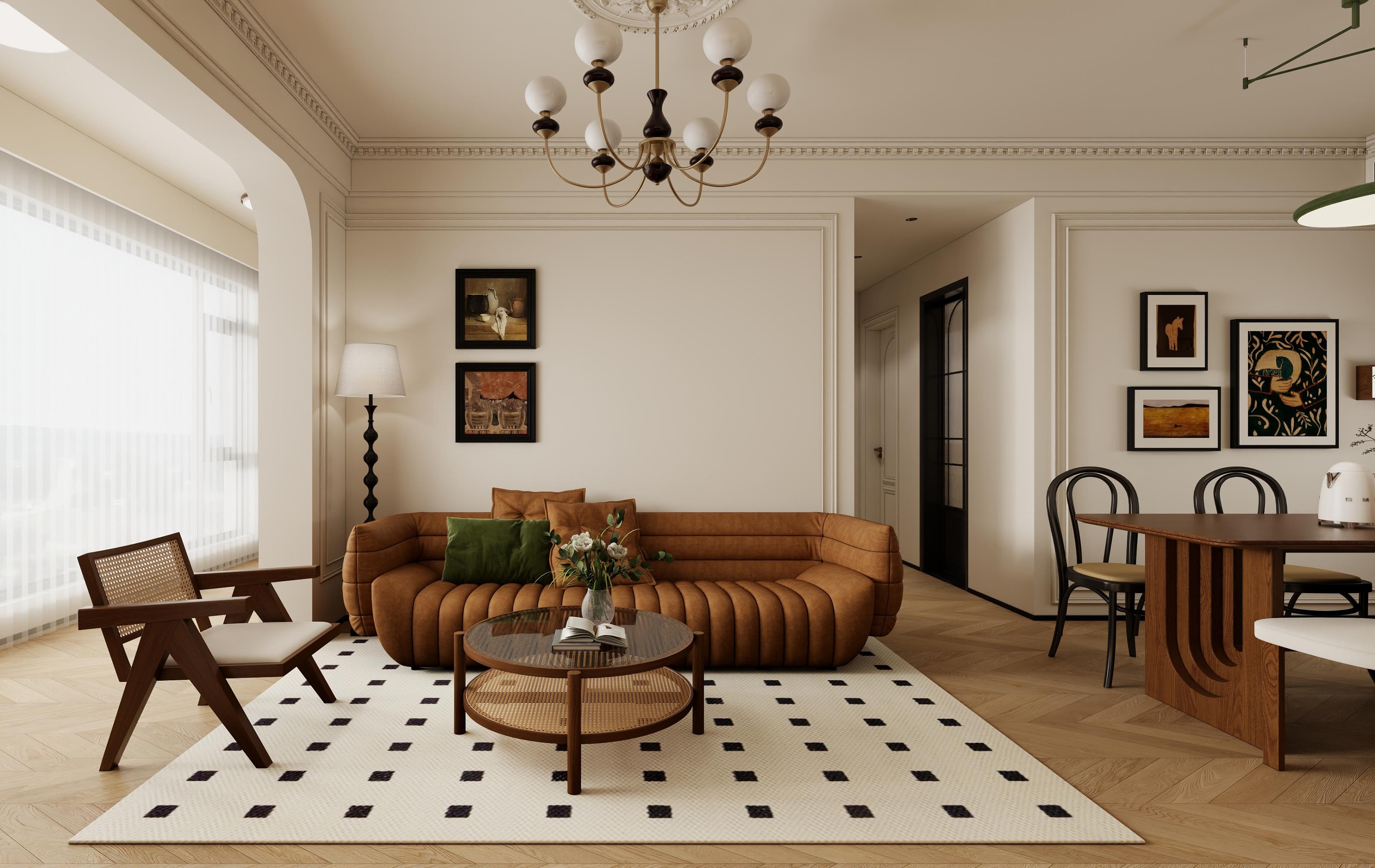 整屋以奶油白为主色调,温柔治愈,搭配焦糖色与黑色点缀,营造复古高级感,拱形门洞与弧形墙面弱化空间,搭配石膏雕花线条,法式优雅立现。焦糖色沙发慵懒陷落,空间以呈现温馨舒适为主,保留原有三房格局,地面材质也是考虑用人字铺地板,温润质感,提升生活品质。