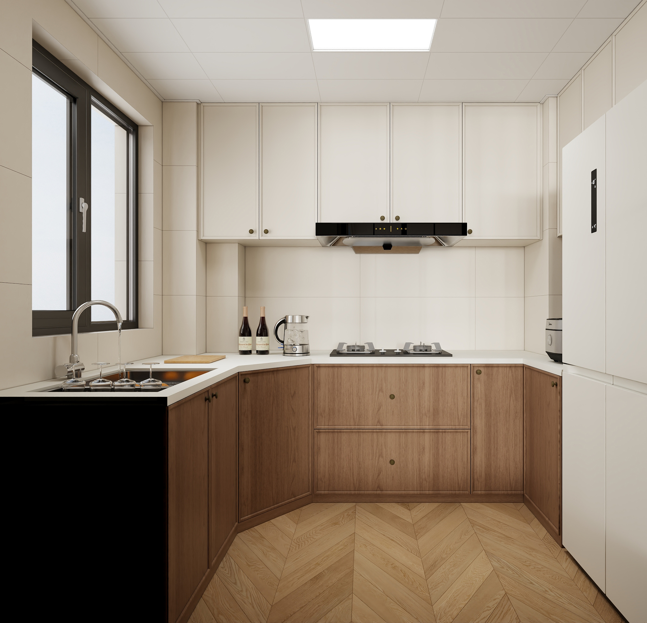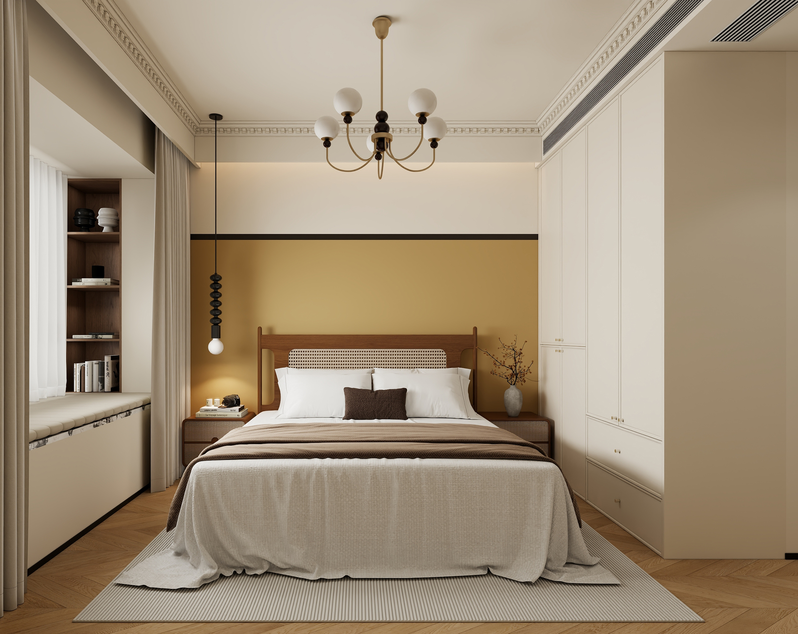 整屋以奶油白为主色调,温柔治愈,搭配焦糖色与黑色点缀,营造复古高级感,拱形门洞与弧形墙面弱化空间,搭配石膏雕花线条,法式优雅立现。焦糖色沙发慵懒陷落,空间以呈现温馨舒适为主,保留原有三房格局,地面材质也是考虑用人字铺地板,温润质感,提升生活品质。